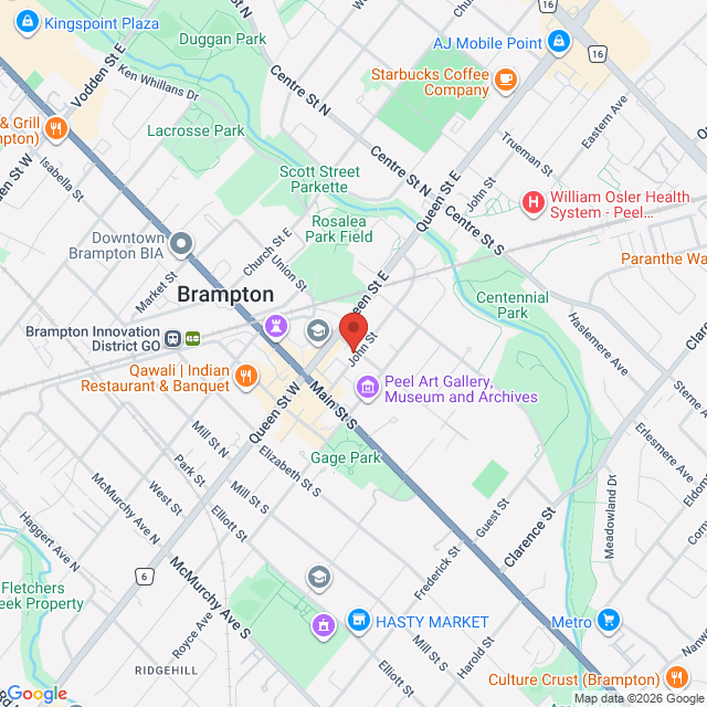 The clinic is a in a residential space at 32 John Street, Brampton. We are located at the corner of John and Chapel St., across from Brampton City Hall. Please be mindful that John St. is a one way street.